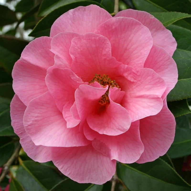 A beautiful free flowering semi-double camellia with silvery-pink flowers and pale orange stamens. Evergreen foliage and a strong upright growth habit.